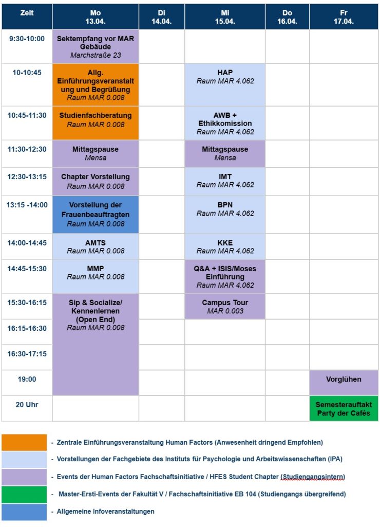 Die Ersti-Woche für das Sommersemester 2026 findet vom 13. bis 17. April 2026 statt. Die Einführungsveranstaltung ist am 13.04. von 10:00 bis 10:45 Uhr in Raum MAR 0.008 (MAR-Gebäude, Marchstraße 23, 10587 Berlin. Oder hier: Campusplan). Außerdem wird es Vorstellungen der Fachgebiete und viele Events zum Kennenlernen geben.